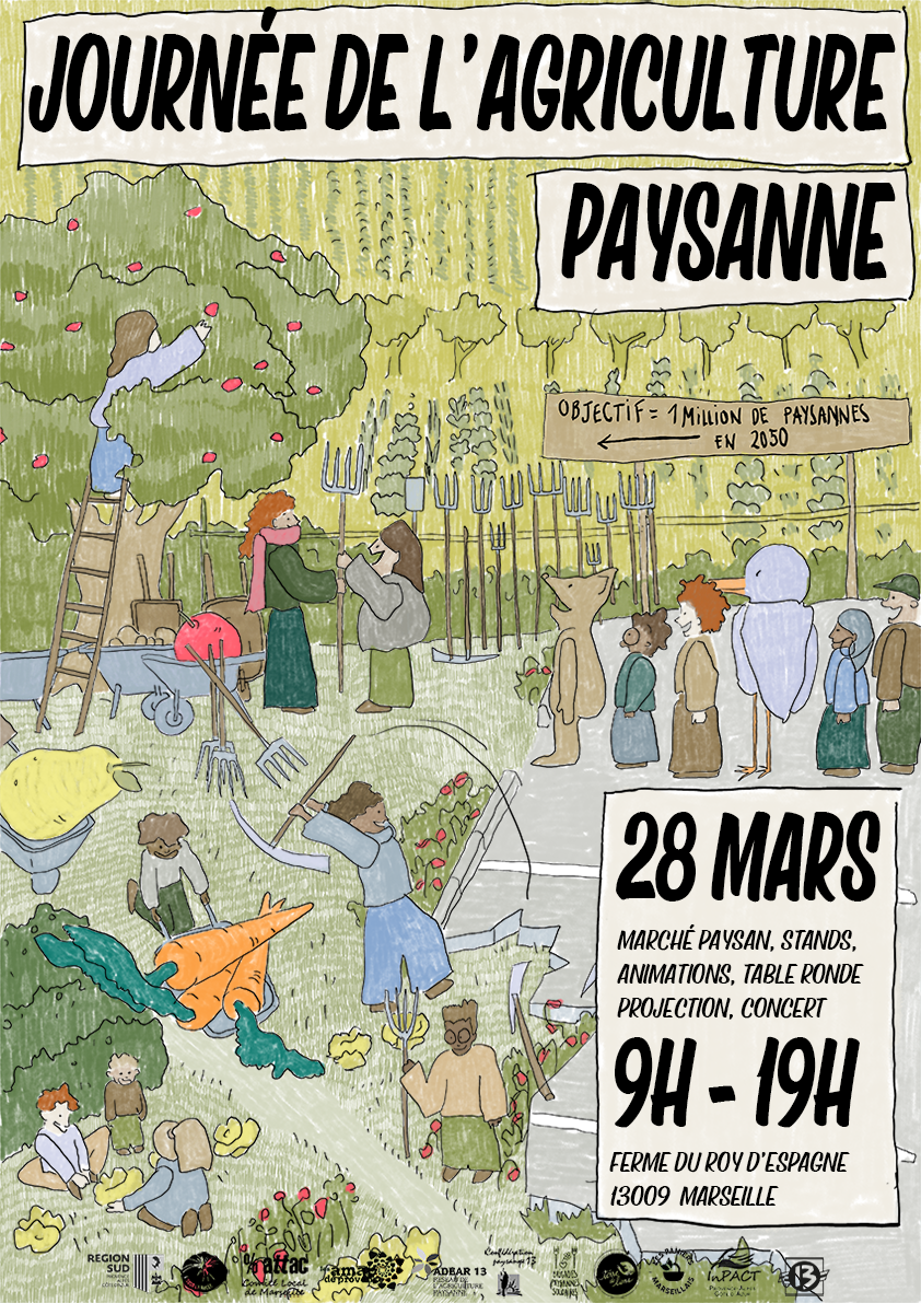Le comité organisateur : la ferme pédagogique du Roy d’Espagne, Les Paniers Marseillais, l’ADEAR 13, ATTAC Marseille, Terre de liens PACA, la Confédération paysanne 13, les Brigades Paysannes.