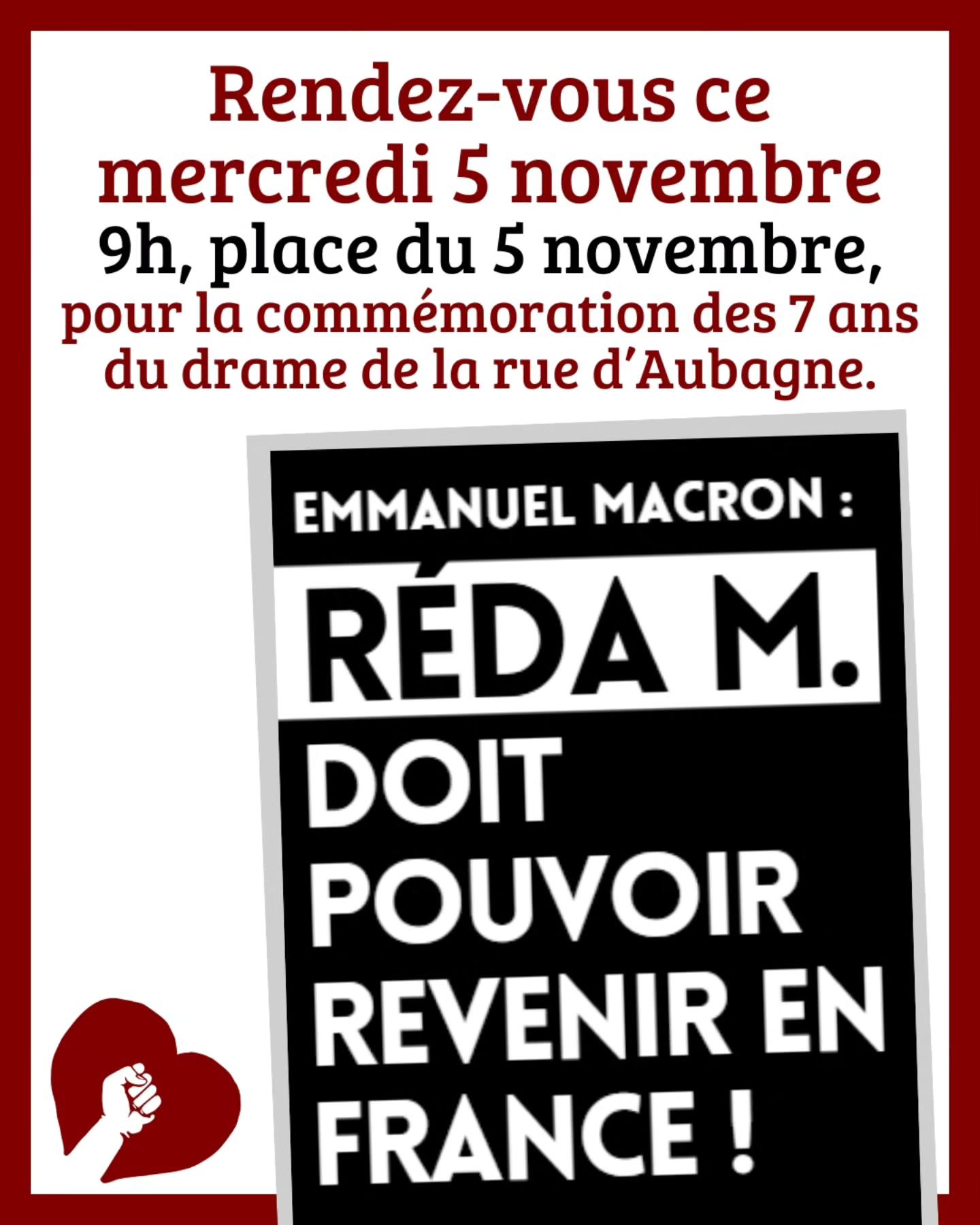 Ce mercredi 5 novembre, nous commémorons les 7 ans du drame. Réda ne pourra donc pas être des nôtres. Nous vous appelons à venir nombreux et nombreuses pour lui faire savoir que nous pensons à lui et faire en sorte qu’Emmanuel Macron entende notre demande et y réponde positivement.