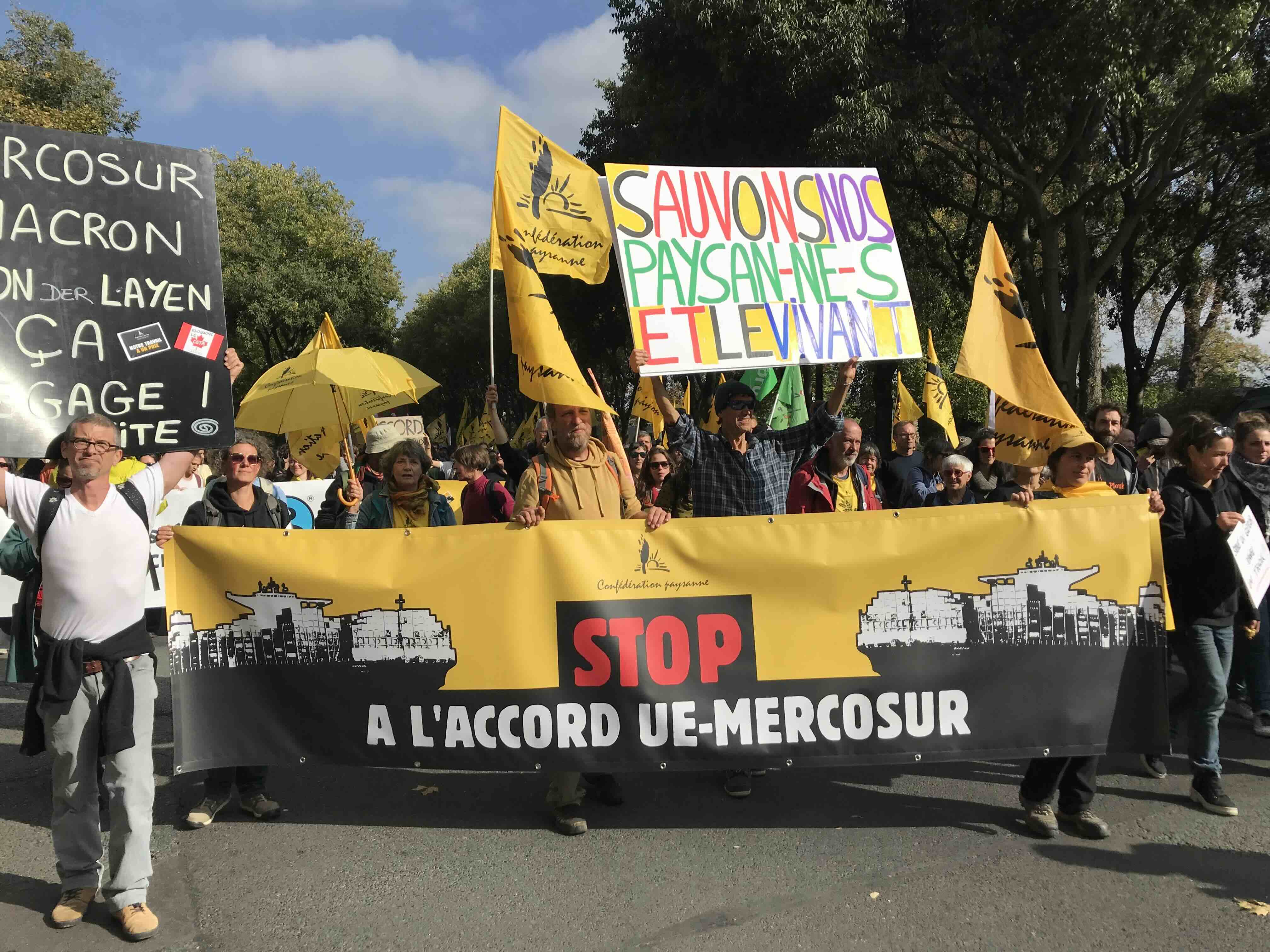 Sous un généreux soleil d’automne, une manifestation dynamique et déterminée a de nouveau interpellé Emmanuel Macron : alors que le contenu de l’accord n’a pas été modifié d’un millimètre, pourquoi la position de la France a-t-elle changé ? Cet accord, le plus nocif jamais négocié par l’Union européenne depuis des années, est et restera inacceptable.