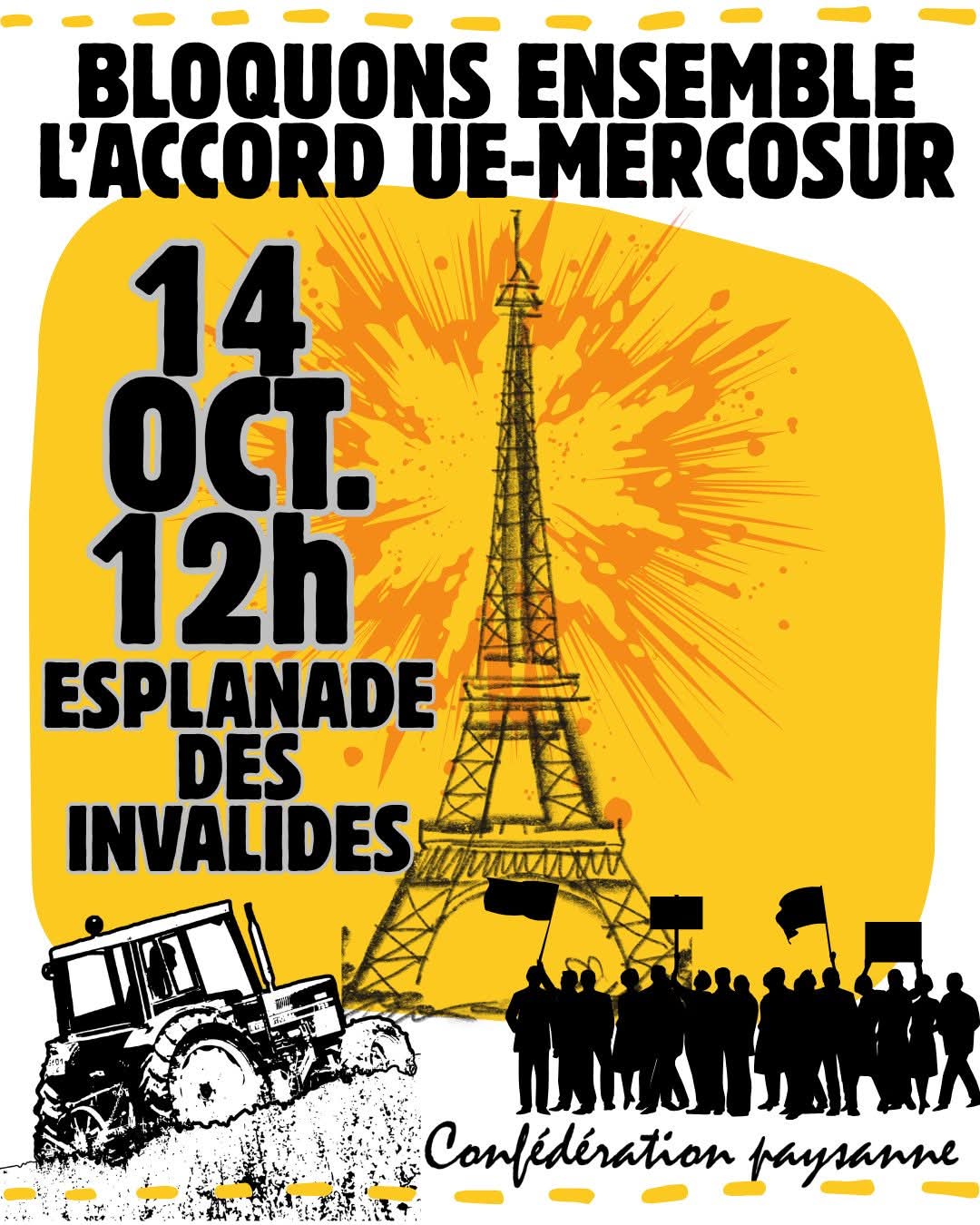 A l’appel de la Confédération paysanne, rejointe par une cinquantaine d’organisations de la société civile (syndicats, associations, ONG, collectifs etc. dont Attac France), plusieurs tracteurs et un millier de personnes ont manifesté des Invalides au Champ-de-mars, au pied de la Tour Eiffel pour dire, une nouvelle fois : « Pour nous, l’accord de libre-échange UE-Mercosur, c’est NON ».